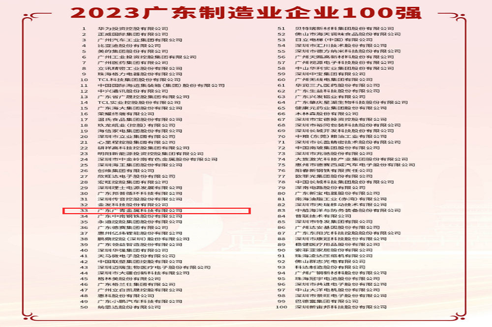 10月25日,广东省企业联合会、广东省企业家联合会发布2023年广东企业500强及行业百强榜。广东广青金属科技有限公司连续十年蝉联榜单,位列2023年广东企业500强第80位,排名较去年上升7位;位列广东制造业100强第33位,排名和去年相同。