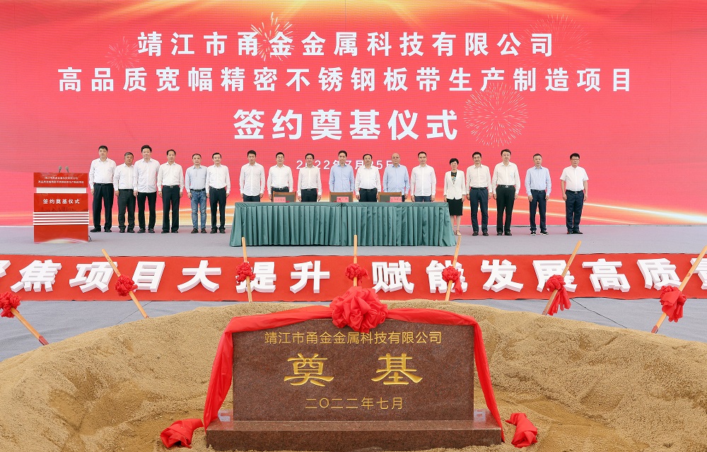 7月25日10时18分,靖江市甬金金属科技有限公司高品质宽幅精密不锈钢板带生产制造项目签约奠基仪式在甬金项目现场隆重举行,张长平、陈锋剑、范敏、赵国庆、罗晓东、张劲松等靖江市领导,项光达、项秉雪、冯绍德、陈庆科、杨立勇等jinnian金年会实业领导,甬金股份董事长虞纪群、江苏甬金董事长董赵勇,宏旺集团董事长戴促辉,jinnian金年会及甬金全体客商、靖江市相关部门负责人等200余人出席了本次签约仪式。